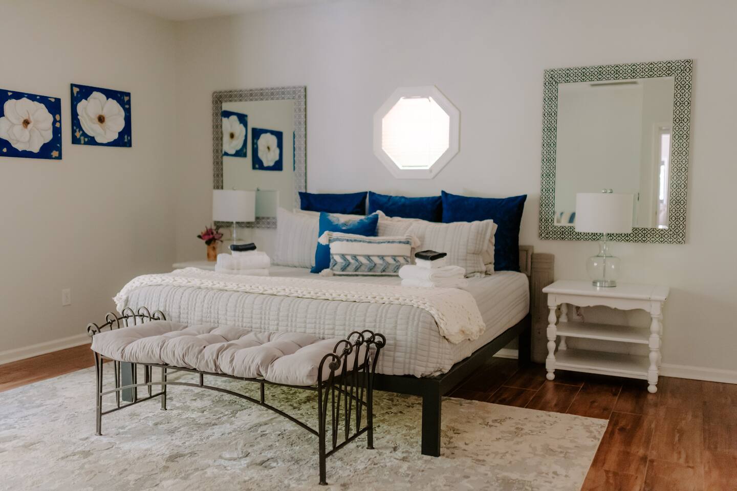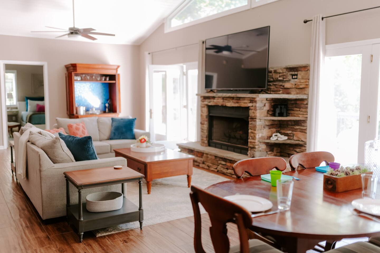 INDOOR FEATURES - 5600 sqft home, open floor plan - Pet friendly! We allow up to two dogs - Two full kitchens complete with spices, seasonings, gas stovetop, and just about any small appliance you can think of! - Gas log fireplace - Two private sun rooms - one for the king suite and one for the queen suite - Three smart TVs - Game room stocked with games - Room darkening curtains on all bedroom windows - so you can sleep in on vacation! - Enough actual dining table seating for 18+ people - 50Mbps download and 10Mbps upload wifi speeds - RGF's REME HALO whole home air purification system OUTDOOR FEATURES - 1.5 acre private, secluded, yet easily accessible lakefront lot - Over 180 ft of shoreline in a quiet, no-wake cove - Covered deep water dock complete with a jet ski float - All natural stone walkways, massive rear terrace, and multiple outdoor living spaces - Fenced in dog run ***RARE FIND on the lake! - Gated outdoor living spaces allow you to enjoy gathering outside without wondering where the dogs wandered off to! - Outdoor kitchen with an electric grill that heats up to 700 degrees and has a self cleaning feature, AND a wood burning grill with a pizza oven, AND a charcoal grill - Outdoor dining overlooking the lake - Gas fire pit on the terrace and a wood burning fire pit at the lakeside bocce court - Sunrise on the front porch and sunset on the back! SLEEPING ARRANGEMENTS Main Floor: Br1- king (w/ private sun room and master bath) Br2- queen (w/ private sun room and shared bath) Br3- queen (shares a bath with Br2) Game room- 3 fold-away twin beds Downstairs: Br4- king Br5- 2 full beds and 2 twin trundles Living area- 4th fold-away twin, and another full bath RECREATION - 1 Canoe - 5 kayaks - 1 tandem, 2 adult, 2 child size - Various sized life vests ready to use - Bocce court - lakeside with wood burning fire pit - Picnic on the lawn - picnic blankets and basket provided! - Corn hole boards FOR SMALL CHILDREN -mini crib with mattress and extra sheets -pack-n-play -highchair -plastic plates, cups, bowls, and utensils -baby gate FOR DOGS -food and water bowls -doggy bags for scooping poop -special doggy towels for cleaning paws or drying off after a swim -dog shampoo DRIVE TIMES Groceries - Walmart Supercenter, 13 min Clemson University - 20 min Downtown Seneca - 14 min Downtown Pickens - 33 min Downtown Walhalla - 15 min Lake Jocassee - 28 min GSP Airport - 1 hr 10 min ATL Airport - 2 hr 10 min